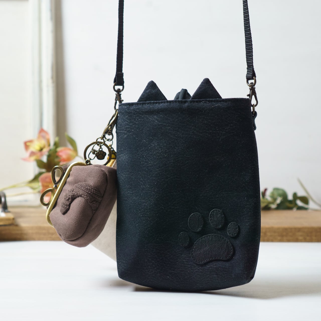 クロ・巾着スマホショルダー・猫耳