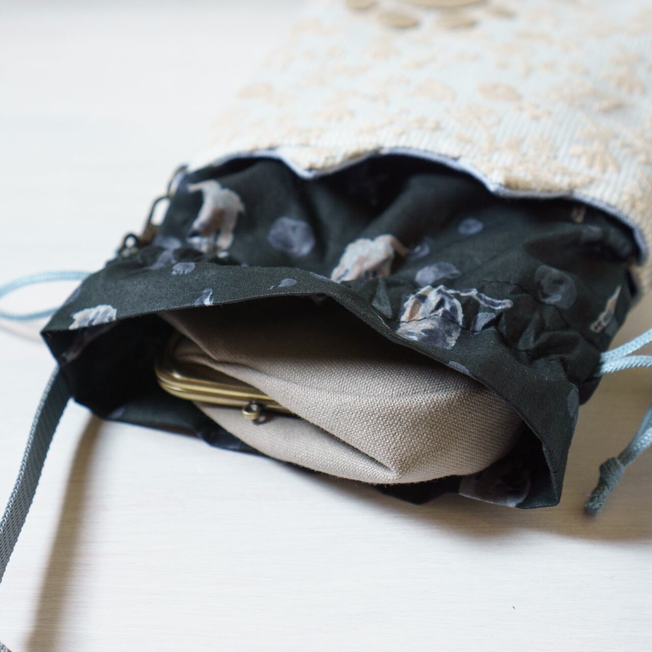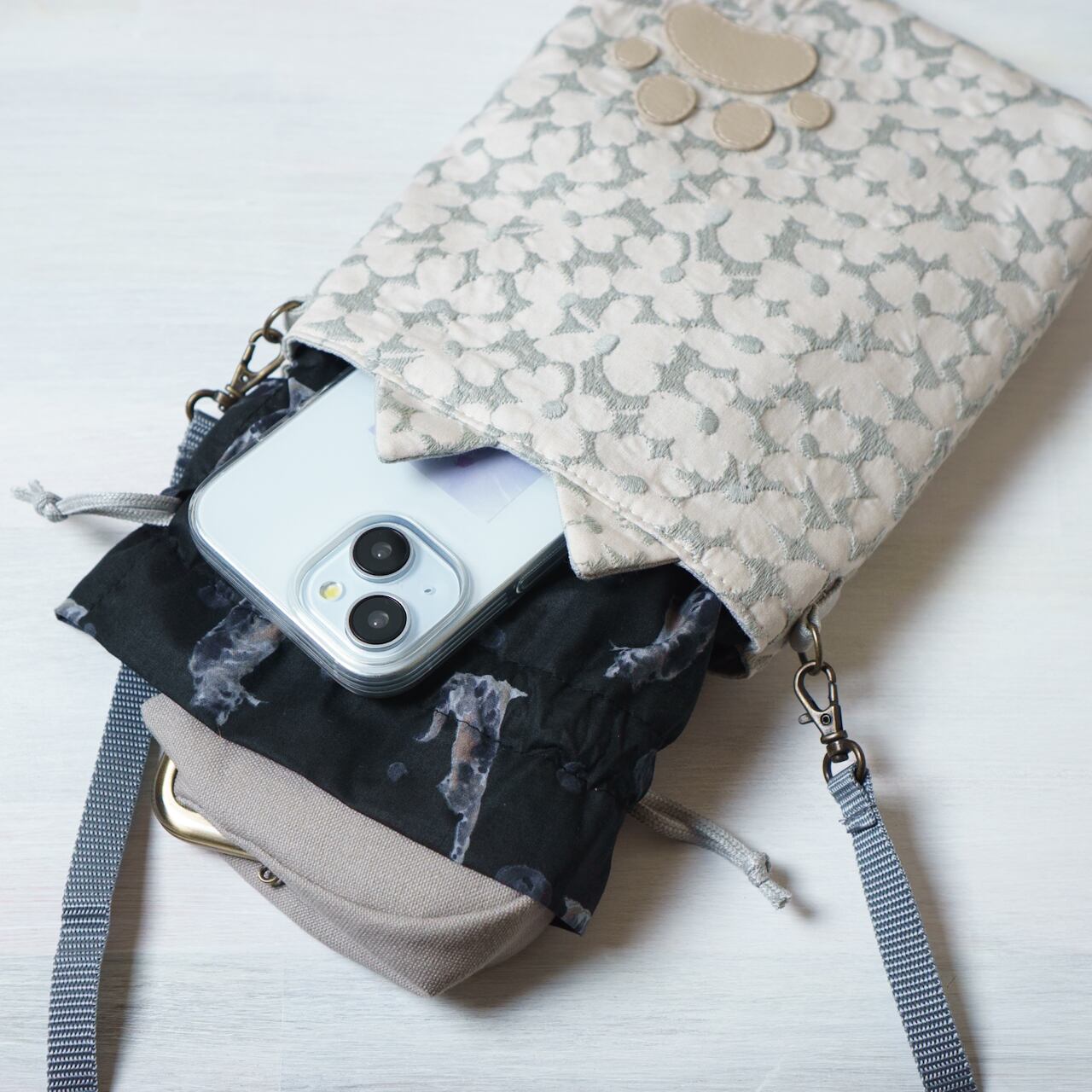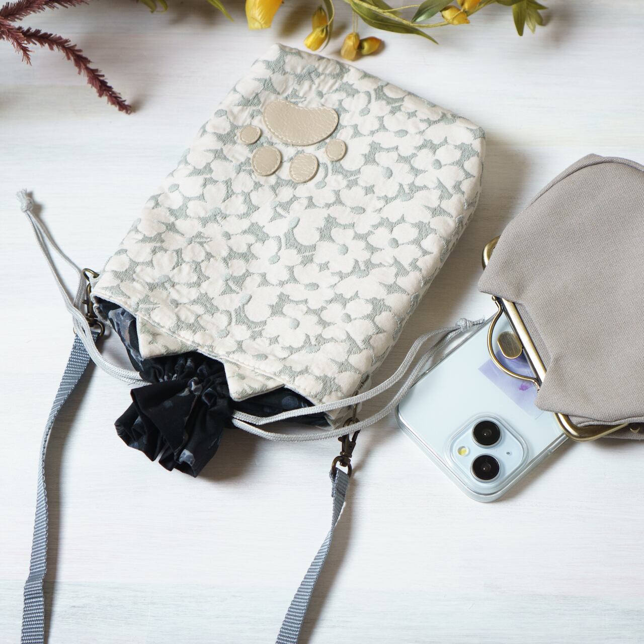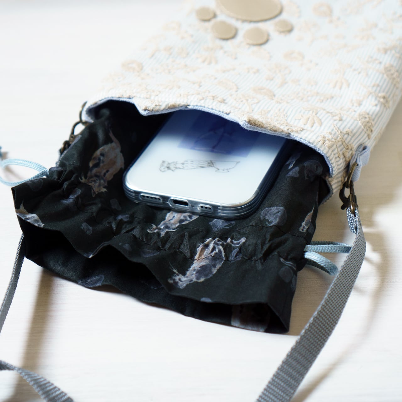 猫耳と肉球のある巾着ポシェットタイプのスマホショルダー