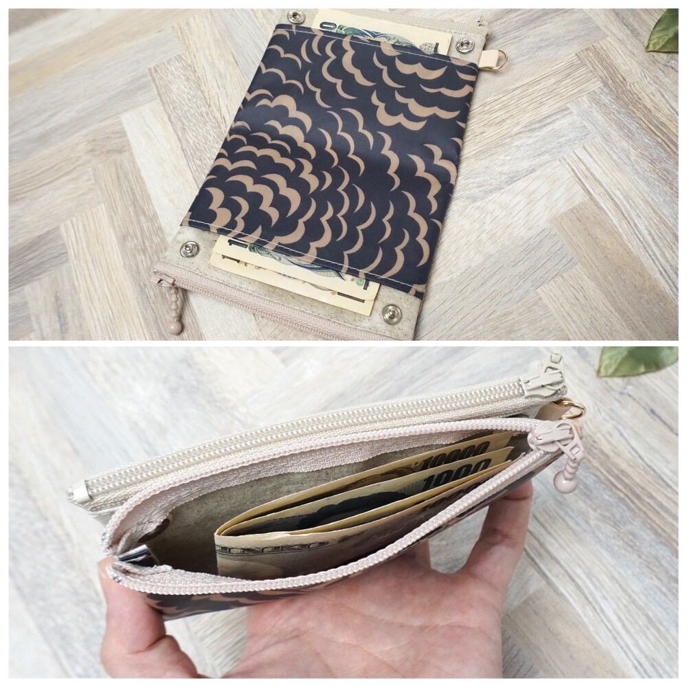 小銭、お札をファスナーごとで分けて薄型財布として使ったり