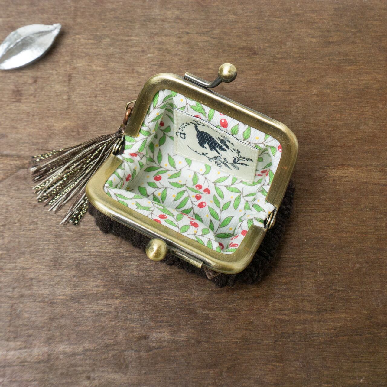 タッセルもがま口本体に合わせ茶系の糸、ゴールドなどの糸を使いタッセルチャームに仕上げました。