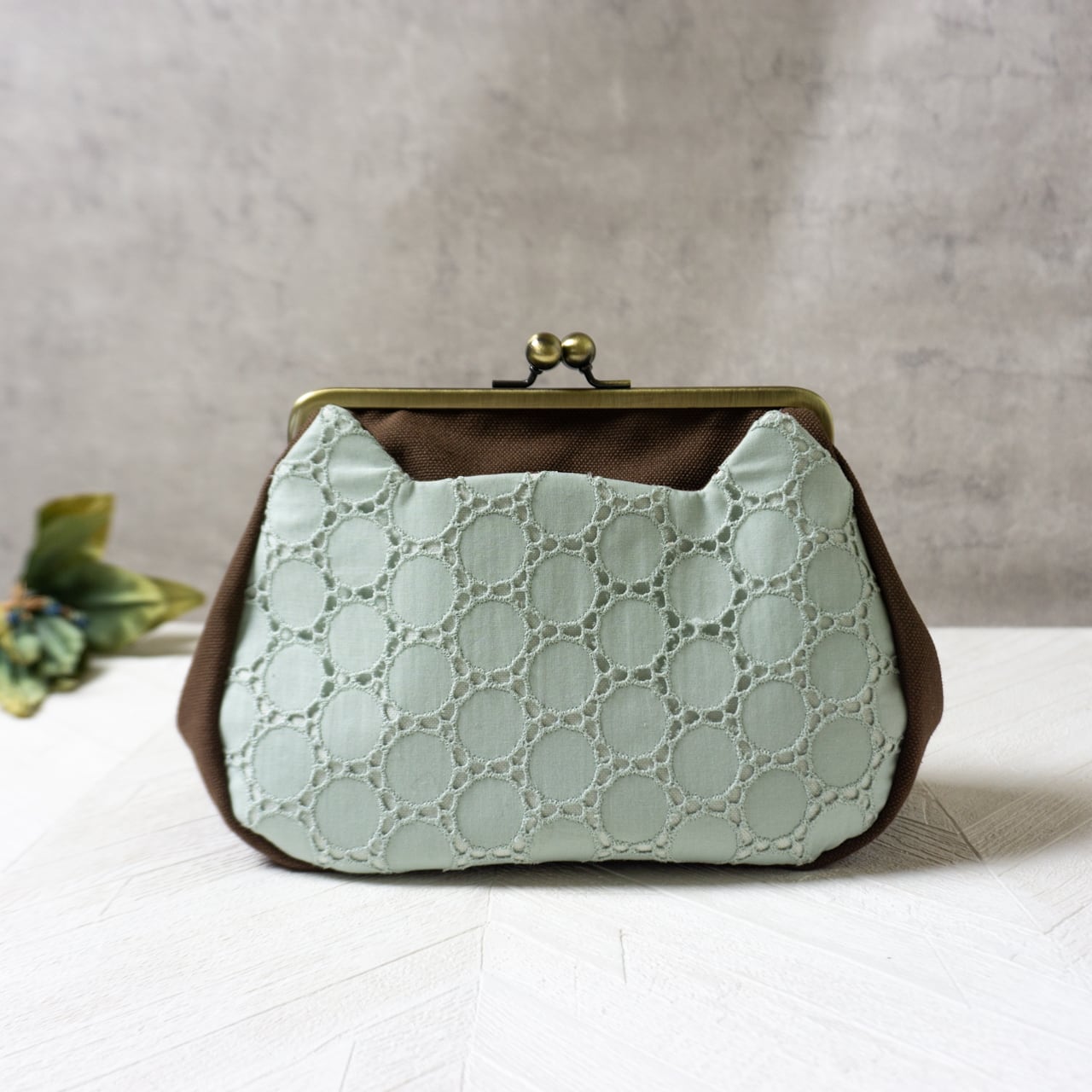 爽やかミント色のレース生地と甘いミルクチョコ色の帆布を組み合わせて「チョコミント」に仕上げました。