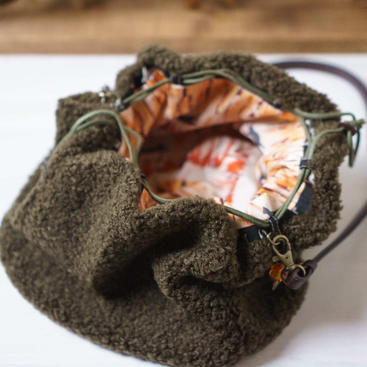 ショルダーストラップをつけているので、肩にかけたまま巾着の紐を引っ張って開けられます。