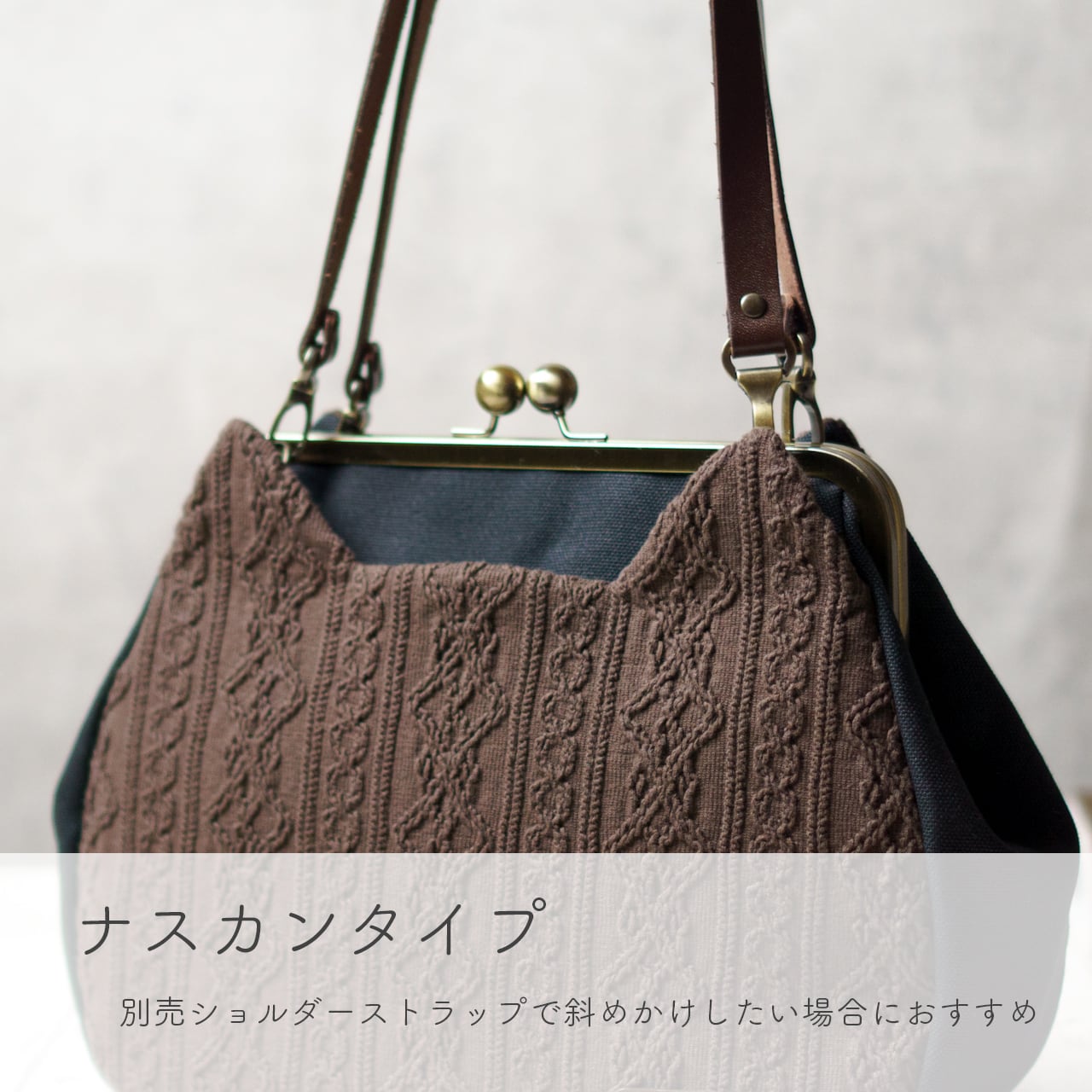 合わせる持ち手は、「ヌメ革のこげ茶」か「合皮アクリルテープのこげ茶」がオススメ