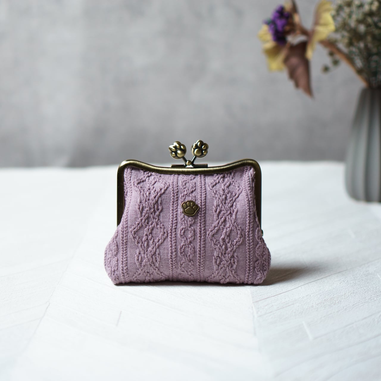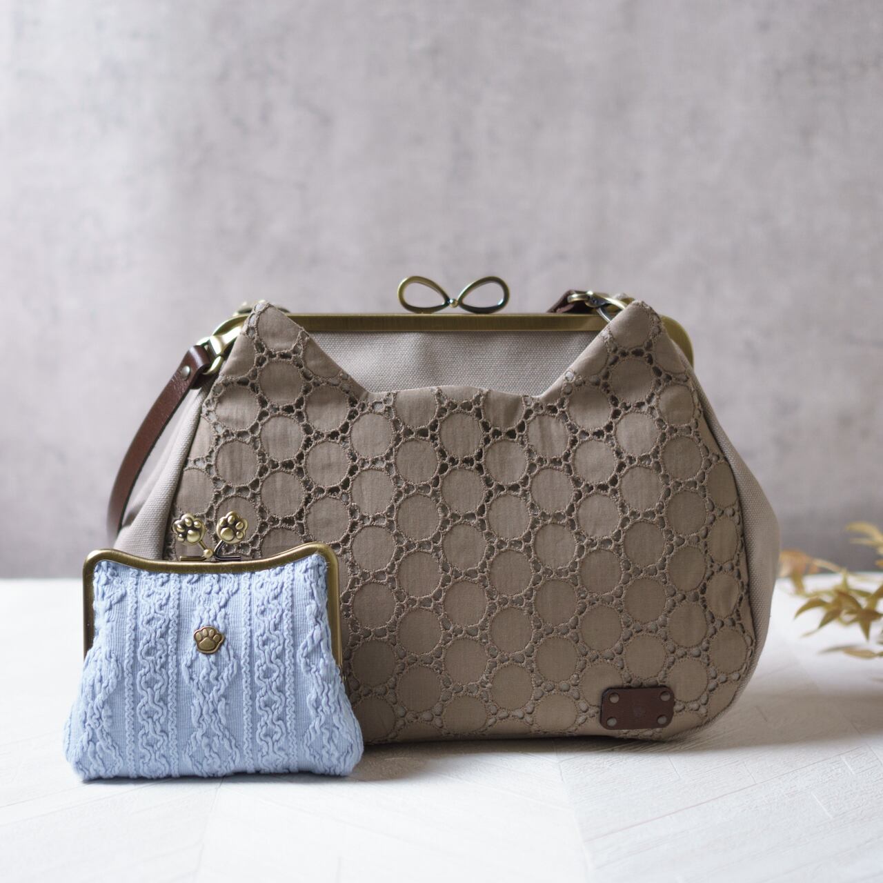 可愛い「猫+肉球のがま口金」と立体感のある「編み模様生地」で『猫大好き』なポーチに仕上げました。
