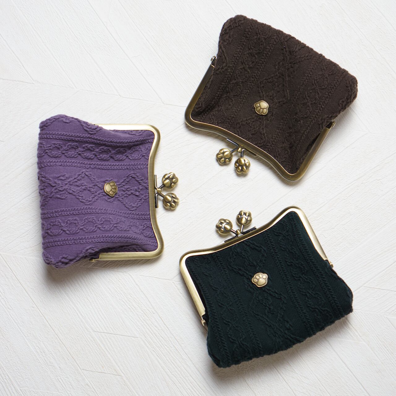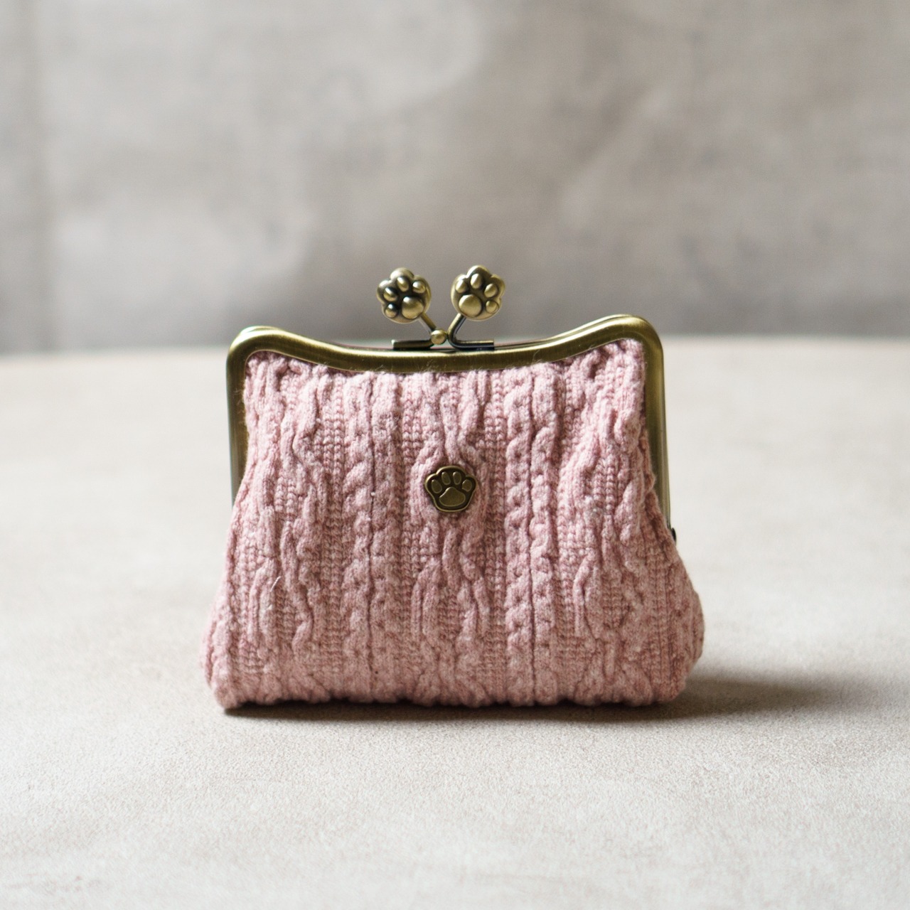 可愛い「猫+肉球のがま口金」と立体感のある「編み模様生地」で『猫大好き』なポーチに仕上げました。